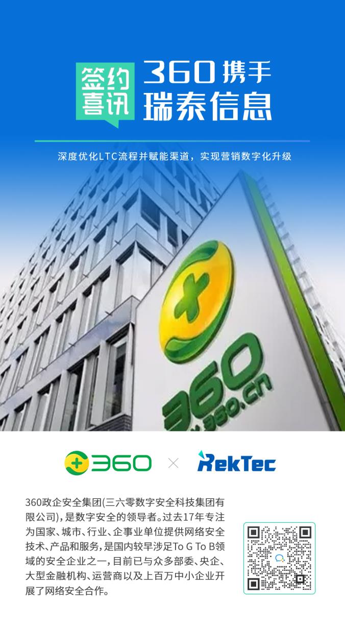近日,360政企安全集團(三六零數字安全科技集團有限公司,以下簡稱:360)攜手瑞泰信息,再度聯手打造360政企安全CRM三期項目。
