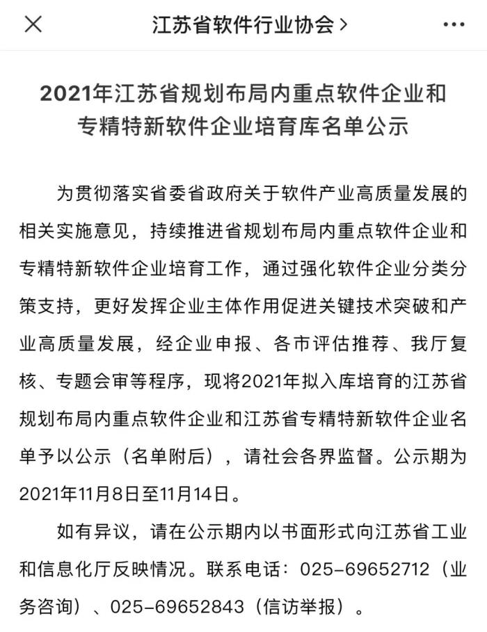 近日,2021年江蘇省規(guī)劃布局內重點軟件企業(yè)和專精特新軟件企業(yè)培育庫名單公示,瑞泰信息成功上榜,再創(chuàng)佳績,祝賀!